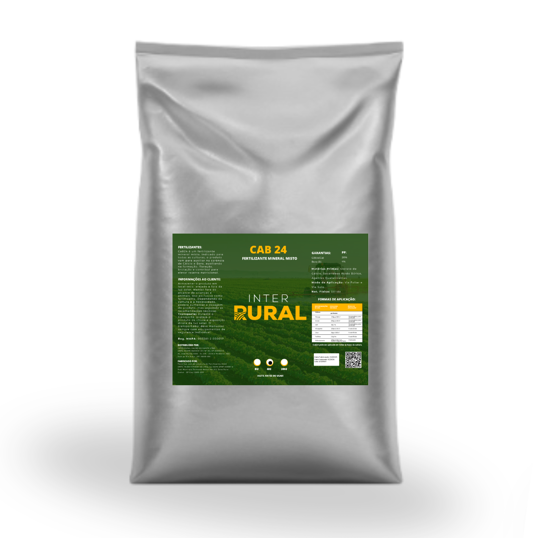 O CaB 24 é um fertilizante mineral de Cálcio e Boro, com 20% de cálcio e 4% de boro. Atua na formação, floração, brotação e reserva nutricional da planta. Favorece o pegamento de flores, fortalece os tecidos e reduz perdas por abortamento floral, sendo aplicado via solo ou foliar para máxima eficiência.